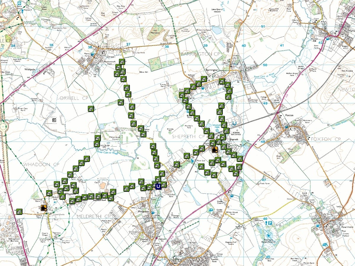 In terms of the walk, notes indicate that I parked in Meldreth village and walked west towards Whaddon. This made a clockwise loop back to Meldreth. After this I moved the car to Shepreth and walked a big figure-of-eight loop there.