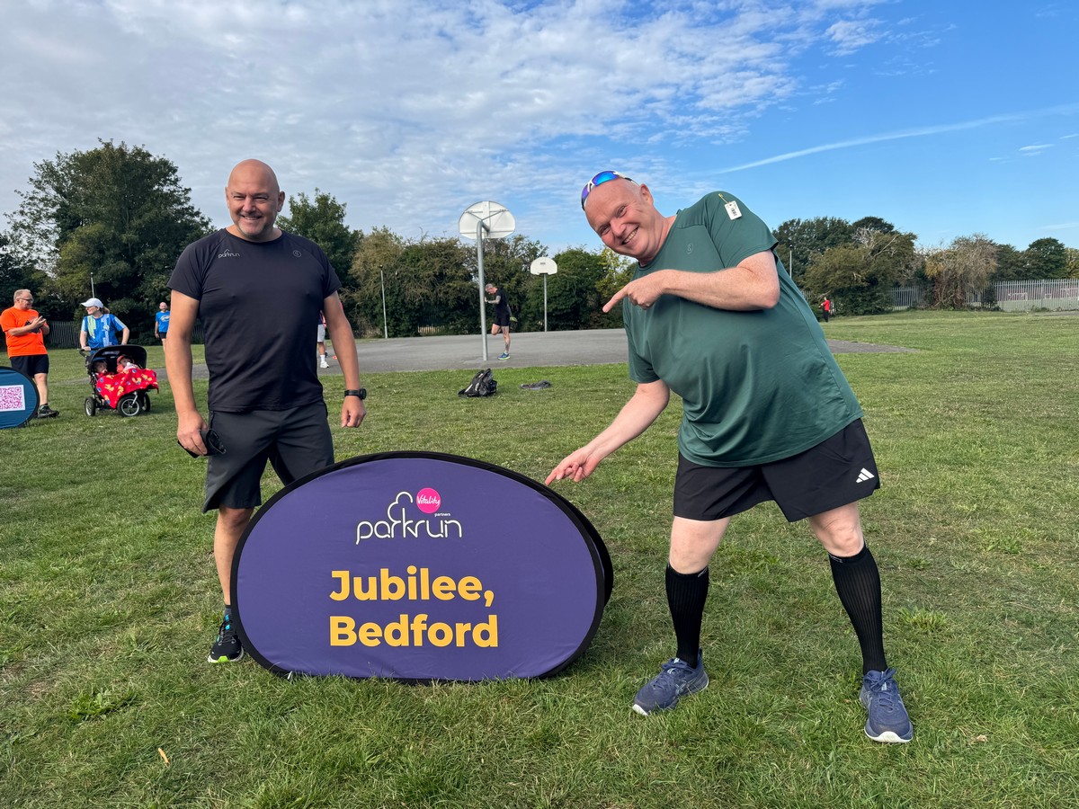 Parking was a straightforward affair at the nearby John Bunyan School. Volunteers confirmed the route was flat-ish and runner-friendly. The urban park setting was compact and peaceful. All tarmac, but with plenty of space on the grass to overtake. It lacked any calf-crunching climbs. We did the obligatory photo-by-the-sign to mark the occasion, but couldn’t hear the briefing.