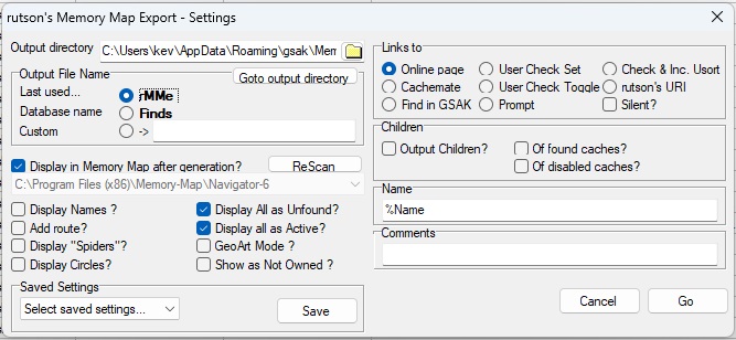 - Select a database in GSAK that has some caches in it and then Run the GSAK macro for the first time. This will, amongst other things, hunt for an installed version of Memory Map and create the relevant folders for later use. It installs rutson’s original icons into the directory but doesn’t use them.
